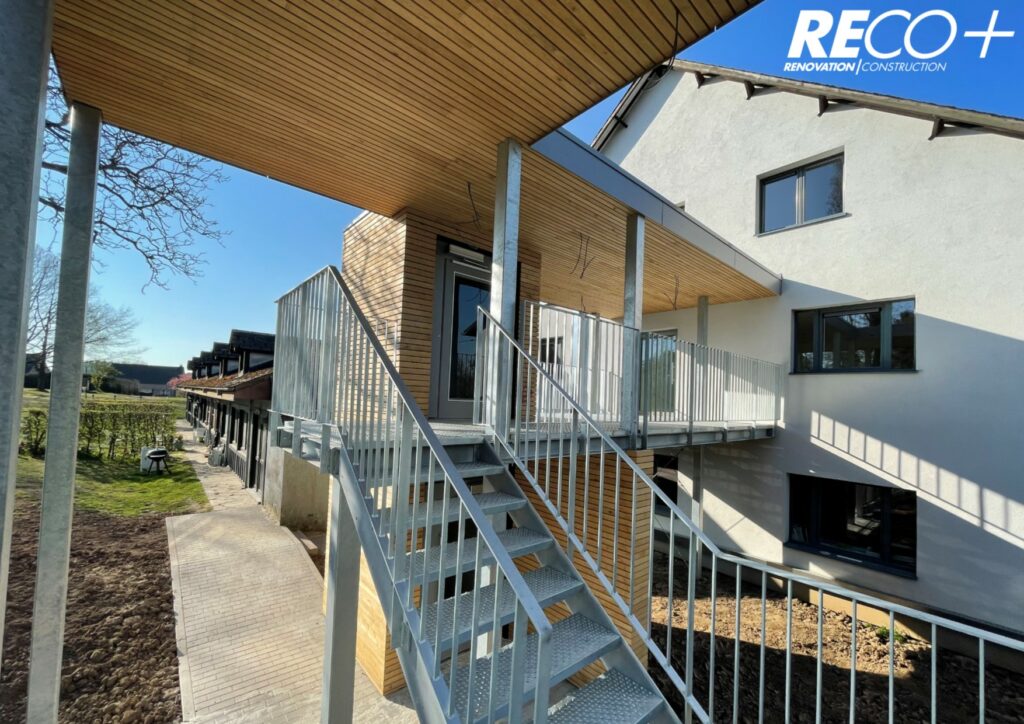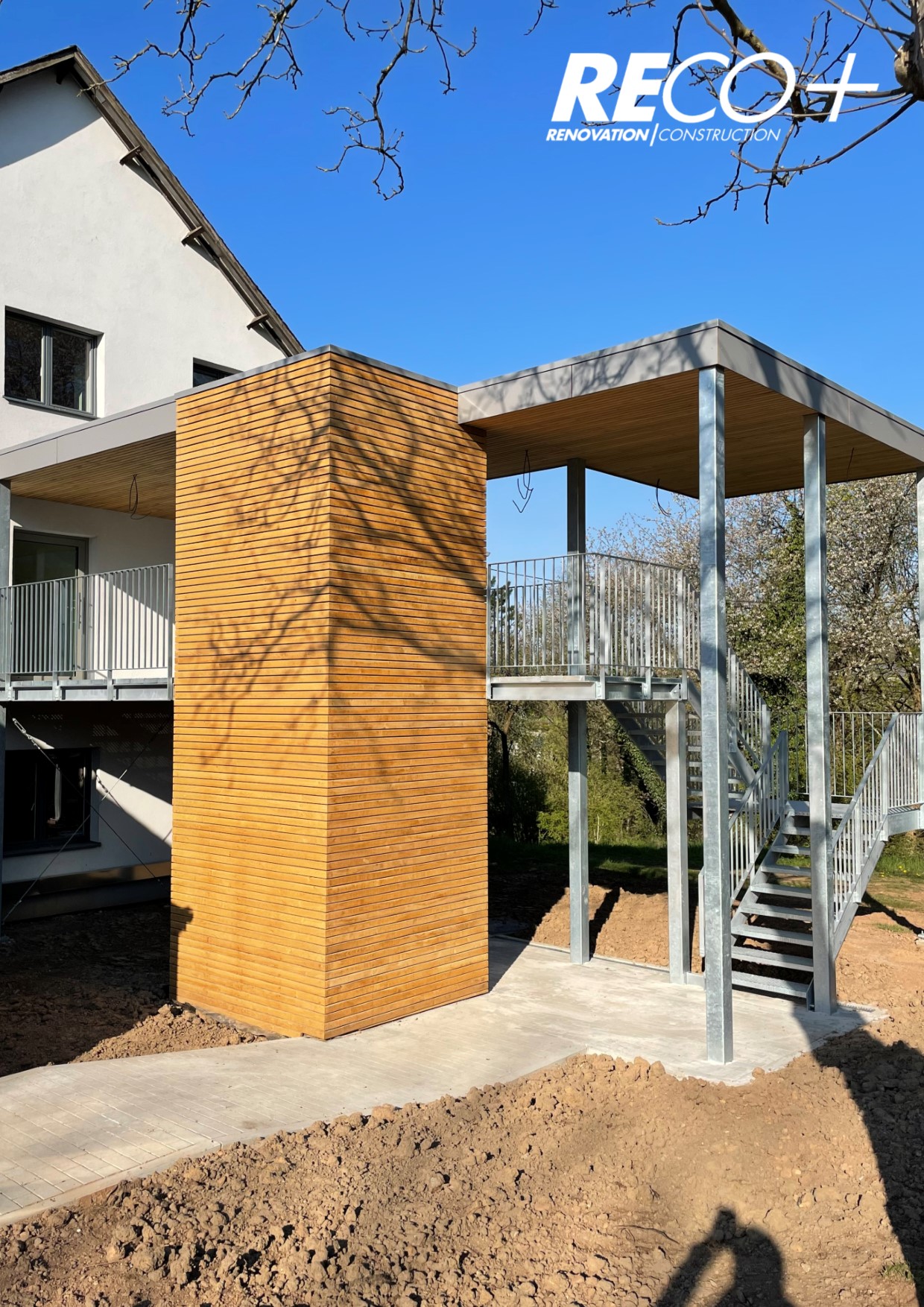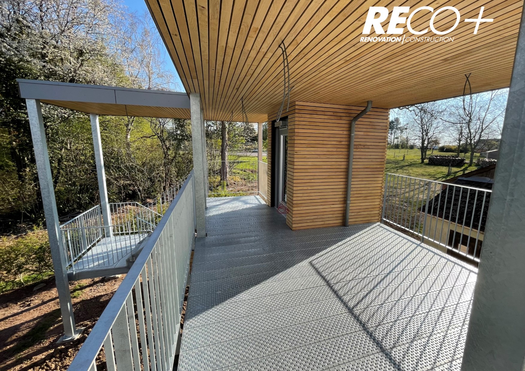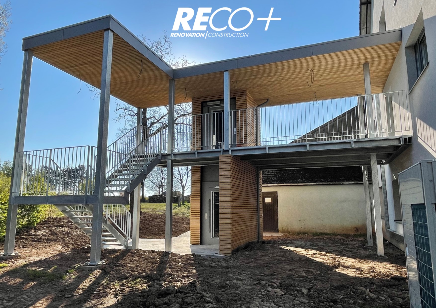 - Particularités : La finalisation du projet se distingue par la création d’un accès PMR sur mesure. Celui-ci repose sur une solide structure en acier galvanisé, habillée d’un élégant bardage ajouré en chêne local (certifié PEFC), et intègre un lift PMR pour garantir une accessibilité totale, sécurisée et pérenne.
