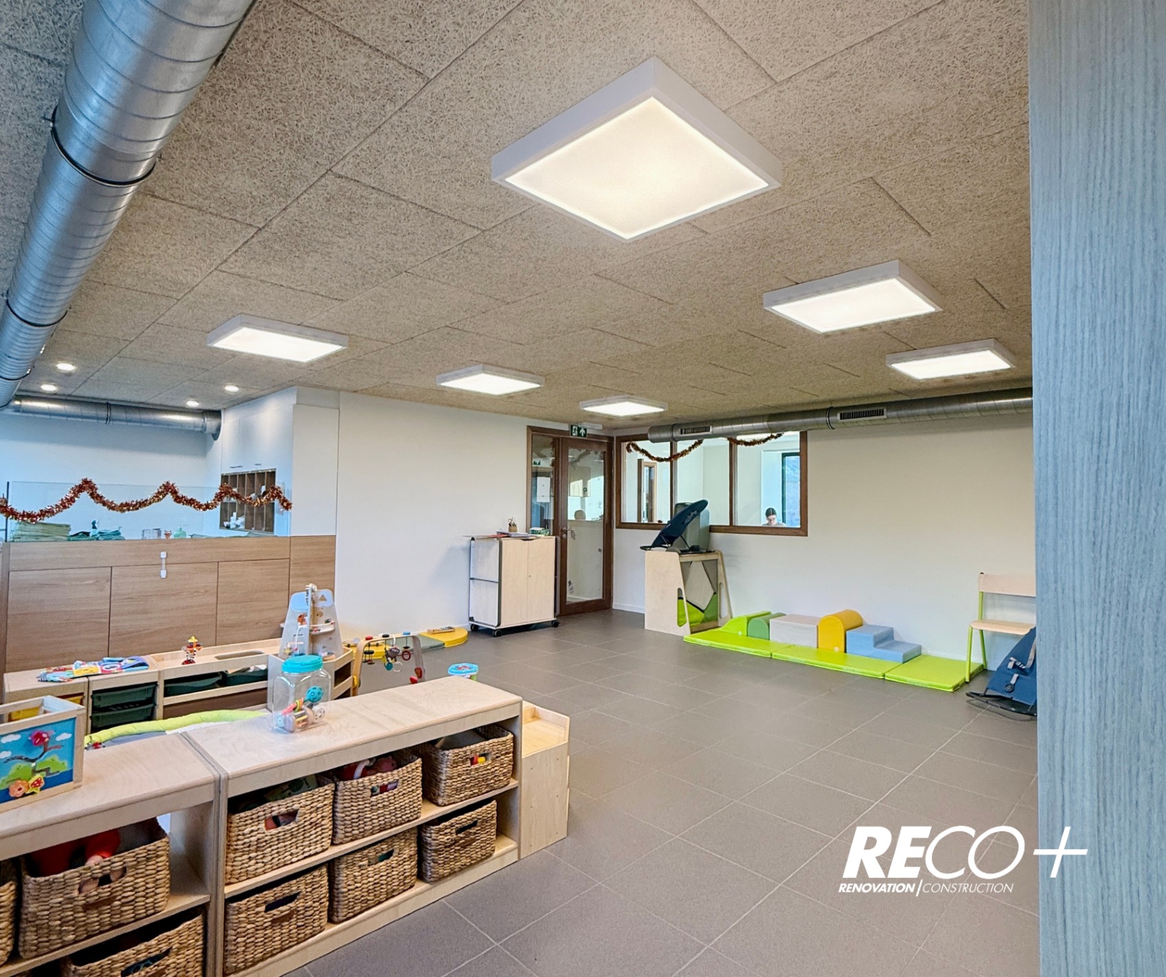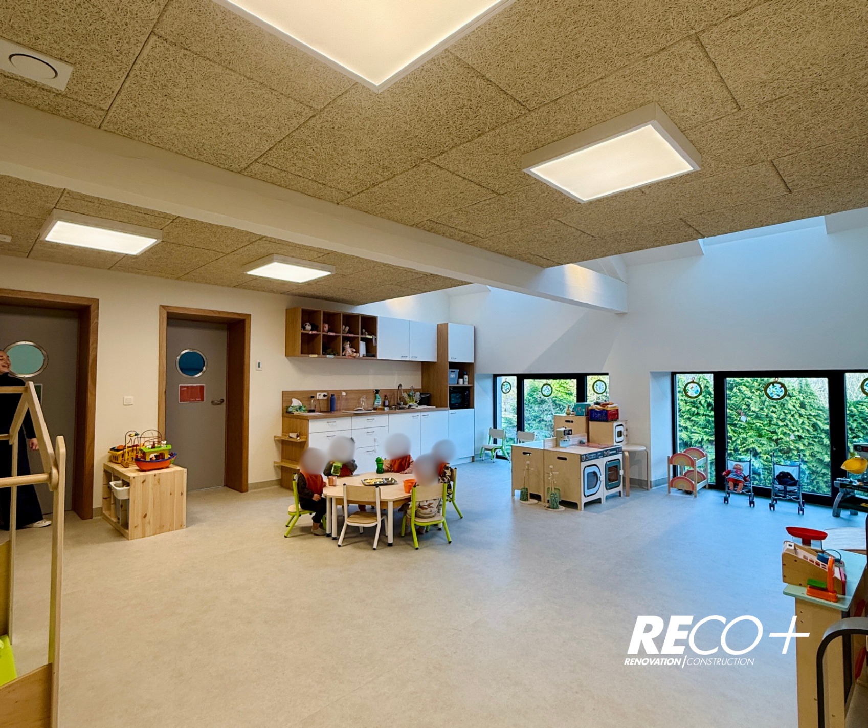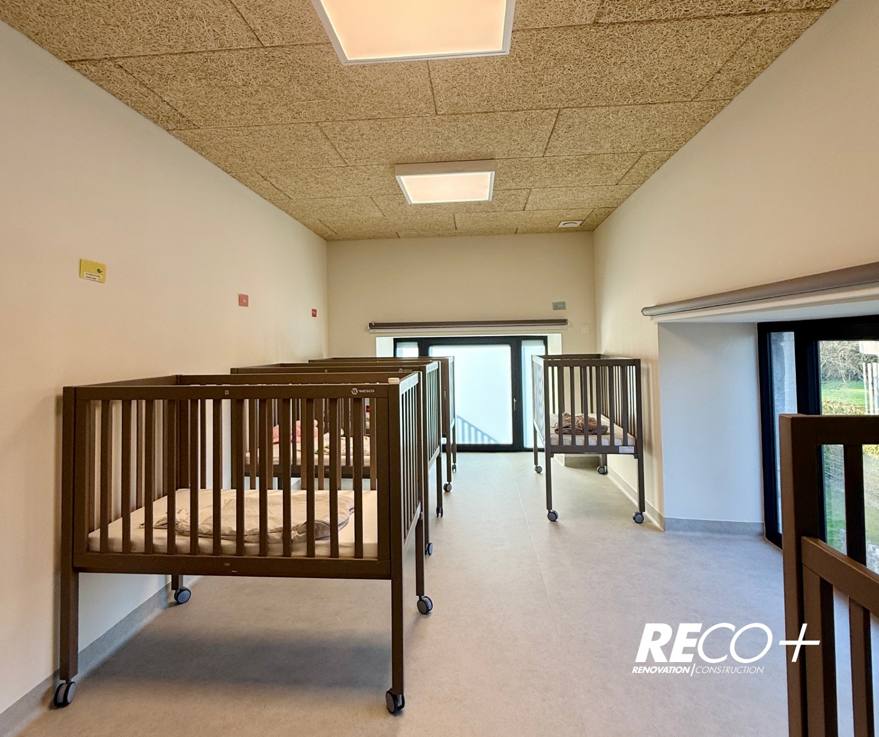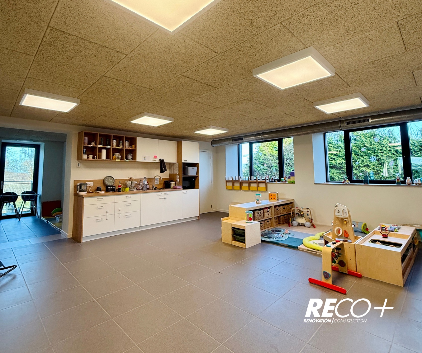 - Particularités : Création de locaux lumineux et confortables, pensés pour favoriser l’éveil, le jeu et le repos. Le chantier a impliqué une mise aux normes stricte (incendie, techniques et réglementaires) propre aux milieux d’accueil de la petite enfance. Ce chantier d’inscrit dans le plan Cigogne.